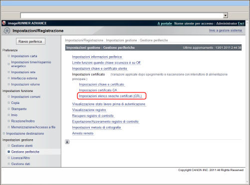 Questa funzione consente di registrare/controllare/eliminare un elenco delle revoche dei certificati (CRL).