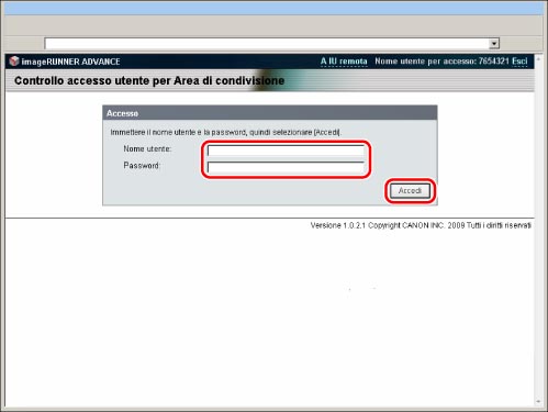 Fare clic su [Esci da Controllo accesso utente] per terminare l'operazione. Se si chiude la pagina del browser senza fare clic su [Esci da Controllo accesso utente], il processo di disconnessione non verrà eseguito correttamente. In questo caso, si noti che non sarà possibile accedere nuovamente per circa 30 minuti.