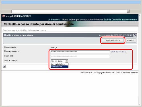 Solo l'amministratore dell'Area di condivisione può registrare/modificare le informazioni relative all'utente nella pagina [Gestione utenti] di [Controllo accesso utente per Area di condivisione]. Gli utenti generici possono modificare solo la propria password. (Vedere "Modifica delle informazioni relative all'utente da parte di utenti generici".)