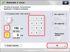 Premere [X] e [Y] → utilizzare i tasti numerici per immettere il formato di scansione espresso in mm → premere [OK].