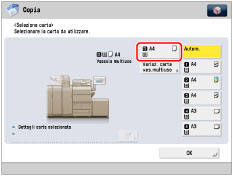 Se per il lavoro in corso la stampa viene alimentata dal vassoio multiuso, per il lavoro successivo è possibile selezionare la carta da [Variaz. carta vas.multiuso]. (Vedere "Prenotazione di lavoro copiatura mediante il vassoio multiuso".)