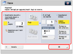 Se si utilizza carta già stampata (ad esempio con il logo dell'azienda) per i fogli da inserire, selezionare [Lascia in bianco]. In caso contrario, la macchina copierà sul foglio prestampato.