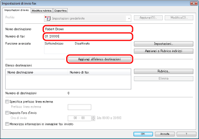 Specificare il nome del destinatario e il numero di fax → fare clic su [Aggiungi all'elenco destinazioni].