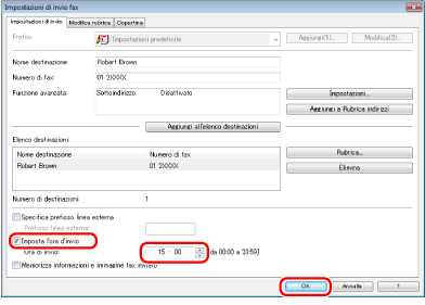 Selezionare [Imposta l'ora d'invio] → specificare l'ora di invio del fax → fare clic su [OK].