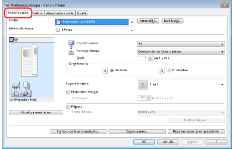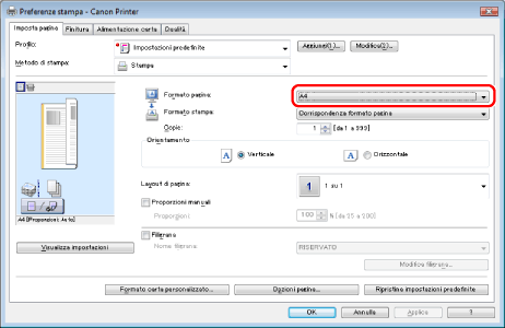 Selezionare il formato pagina del documento creato nell'applicazione da [Formato pagina].