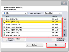 Sie können Papiertypen speichern, die nicht in <Detail. Einstell.> für die Auswahl des Papiertyps aufgeführt sind. Nähere Informationen zum Speichern eines benutzerdefinierten Papiertyps finden Sie im Abschnitt "Speichern/Bearbeiten anwenderdefinierter Papiertypen".