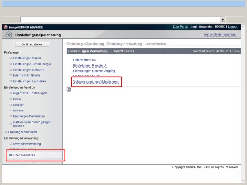 Klicken Sie auf der Seite Portal des Remote UI auf [Einstellungen/Speicherung] → [Lizenz/Andere] → [Software speichern/aktualisieren].
