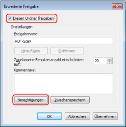 Klicken Sie für Windows Vista/Windows 7 mit der rechten Maustaste auf den Ordner "PDF-Scan" → Wählen Sie [Eigenschaften], um das Dialogfeld [Eigenschaften von PDF-Scan] anzuzeigen → Klicken Sie auf die Registerkarte [Freigabe] → Klicken Sie auf [Erweiterte Freigabe] → Wählen Sie [Diesen ordner freigeben] → Klicken Sie auf [Berechtigungen].