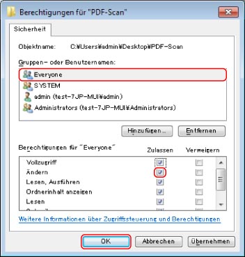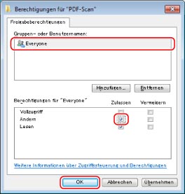 Unter Windows XP wählen Sie [Everyone] → Wählen Sie unter [Ändern] die Option [Zulassen] → Klicken Sie auf [OK]. Unter Windows Vista/7 wählen Sie [Everyone] → Wählen Sie unter [Ändern] die Option [Zulassen] → Klicken Sie nacheinander auf [OK] → [Schließen].