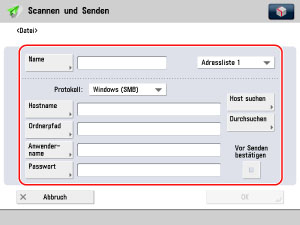 Wenn Sie einen Ordner mit dem Namen "Temporär" im PDF-Scan-Ordner erstellen möchten, geben Sie '\Temporär' ein. Ein Senden ohne Eingabe ist möglich.