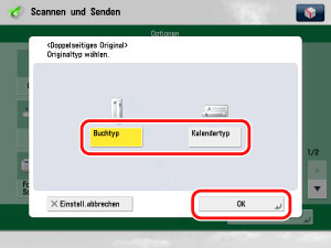 Berühren Sie die Taste [Doppelseitig. Original] → Definieren Sie den Typ des Doppelseitigen Originals → Bestätigen Sie durch Berühren der Taste [OK].