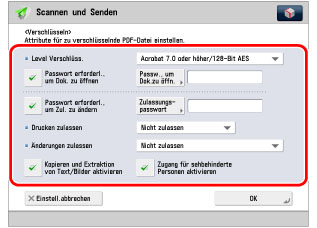 Sie können PDF-Dateien verschlüsseln, indem Sie ein Passwort einrichten. Die PDF-Datei kann dann nur von Anwendern geöffnet, gedruckt oder bearbeitet werden, die das korrekte Passwort eingeben. Für die Verwendung dieser Funktion ist das Universal Send Security Feature Set erforderlich.