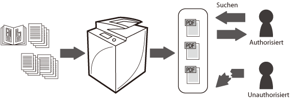 Mit der Funktion zur Erstellung von durchsuchbaren PDF-Dateien können Sie Papierdokumente in PDF-Dateien umwandeln, deren Text durchsuchbar ist. Sie können viel Platz sparen, indem Sie Papierdokumente wie Lebensläufe digitisieren. Die Verschlüsselung der PDF-Dateien sorgt dafür, das unberechtigte Anwender die Dateien nicht öffnen und durchsuchen können. Indem Sie beim Senden gescannter Dokumente ein Passwort einrichten, können Sie verhindern, dass Informationen preisgegeben werden, wenn Dokumente an den falschen Empfänger gerichtet werden.