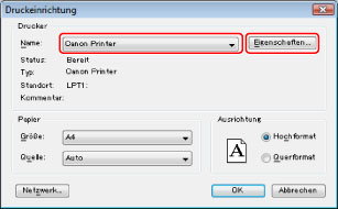 Klicken Sie auf [Datei] der Anwendungssoftware, die Sie zum Drucken des Dokuments verwenden → Öffnen Sie den Druckdialog durch Anklicken der Taste [Druck] → Klicken Sie auf [Eigenschaften].