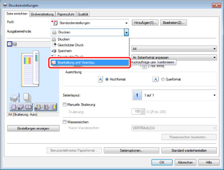 Wählen Sie nacheinander [Ausgabemethode] → [Bearbeitung und Vorschau].