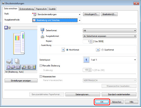 Definieren Sie im Dialog des Druckertreibers die Druckeinstellung der einzelnen Blätter → Kicken Sie auf [OK].