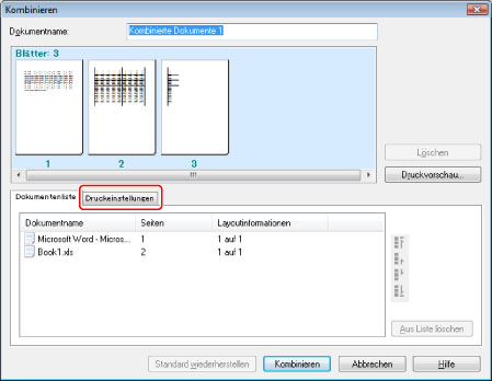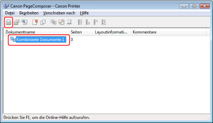 Der Dialog [Canon PageComposer] wird angezeigt. Kombinierte Dokumente werden in der Dokumentenliste angezeigt.