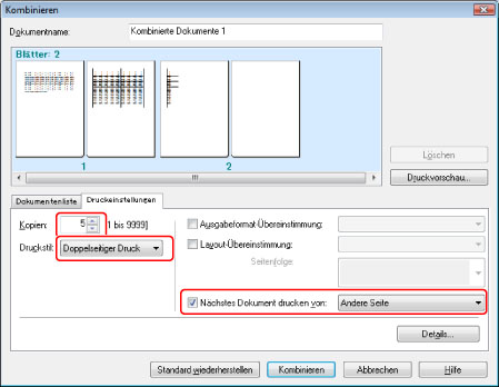 Wenn Sie mit dem Drucken des nächsten Dokuments fortfahren möchten, nachdem Sie ein Dokument mit einer ungeraden Anzahl an Seiten gedruckt haben, wählen Sie [Nächstes Dokument drucken von] → [Andere Seite].
