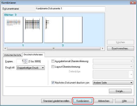 Die Druckvorschau wird angezeigt. Prüfen Sie die Vorschau → Klicken Sie auf [Fertig] und kehren Sie zum Dialogfeld [Combine] zurück.