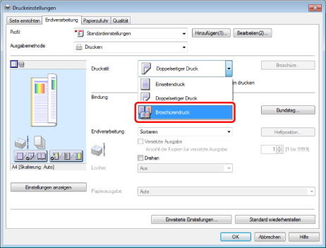 Wählen Sie auf der Registerkarte [Endverarbeitung] unter [Druckstil] die Option [Broschürendruck].
