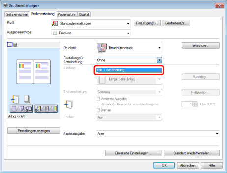 Wählen Sie aus der Auswahlliste [Einstellungen Sattelheftung] die Option [Falz + Sattelheftung] aus → Klicken Sie auf [OK] → [OK].