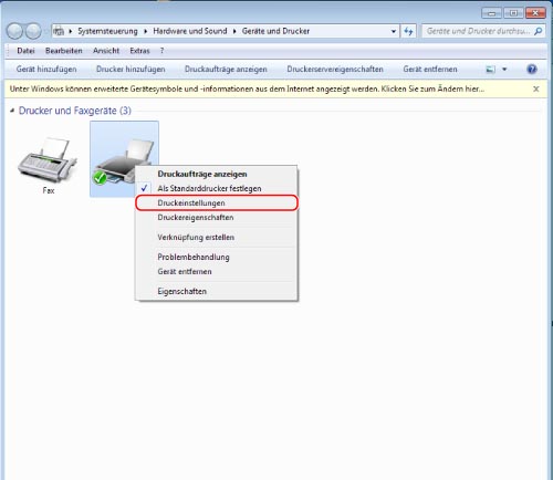 Klicken Sie im Ordner [Drucker] (oder im Ordner [Geräte und Drucker]) mit der rechten Maustaste auf das Druckersymbol für den Drucker, für den Sie Standardeinstellungen festlegen möchten → Klicken Sie auf [Druckeinstellungen].