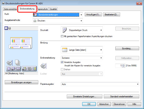 Durch Festlegen von Standard-Druckeinstellungen können Sie dieselben Einstellungen wieder und wieder vorgeben. Sollte beispielsweise Ihre Abteilung nur mit 2 auf 1 Druck arbeiten, können Sie den 2 auf 1 Druck als Standardeinstellung festlegen.