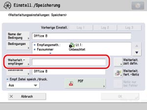 Berühren Sie die Taste [Weiterleit.empfänger] → Wählen Sie aus dem Adressbuch die Faxnummer für die Geschäftsstelle B, die Sie in Schritt 2 eingerichtet haben → Bestätigen Sie durch Berühren der Taste [OK].
