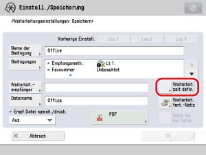 Berühren Sie die Taste [Weiterleit. zeit defin.] → Definieren Sie die Zeit und das Datum, an dem die Weiterleitungsbedingungen gelten sollen.