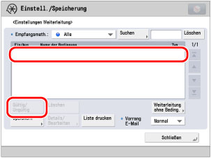 Betätigen Sie [Bedingungen] → Wählen Sie [Fax: Leitung 1] aus der Auswahlliste <Empfangsmeth.:> → Berühren Sie die Taste [OK].