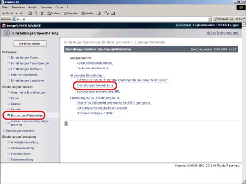 → [Einstellungen Funktion] → [Empfangen/Weiterleiten] → [Allgemeine Einstellungen] → [Einstellungen Weiterleitung].