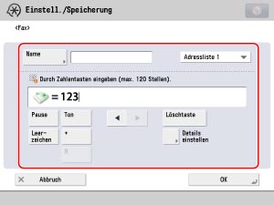 Berühren Sie nacheinander die Tasten [Neue Empf. speichern] → [Fax] → Geben Sie die Faxnummer der Geschäftsstelle B ein.