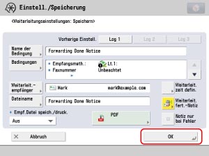 → [Einstellungen Funktion] → [Empfangen/Weiterleiten] → [Allgemeine Einstellungen] → [Einstellungen Weiterleitung] → [Speichern]→ Legen Sie jede Einstellung fest.