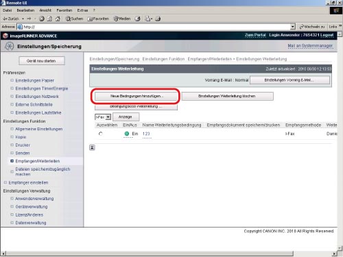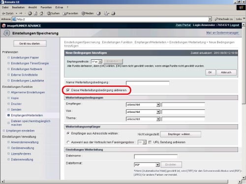 [Diese Weiterleitungsbedingung aktivieren] entspricht der Taste [Gültig/Ungültig] auf dem Display für die Weiterleitungseinstellungen Ihres imageRUNNER ADVANCE-Systems.