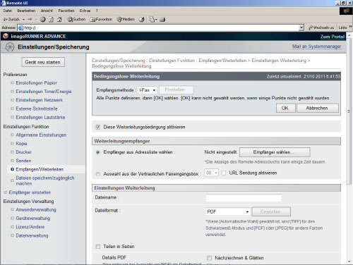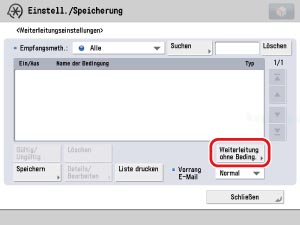 → [Einstellungen Funktion] → [Empfangen/Weiterleiten] → [Allgemeine Einstellungen] → [Einstellungen Weiterleitung] → [Weiterleitung ohne Beding.].