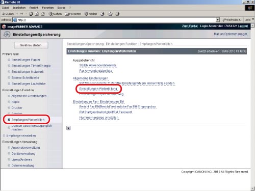 Greifen Sie auf Remote UI zu → Klicken Sie auf [Einstellungen/Speicherung] → [Empfangen/Weiterleiten] → [Einstellungen Weiterleitung].