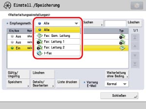 Die Einstellungen sind grundlegend dieselben wie bei der Speicherung einer Weiterleitungsbedingung, wobei jedoch die Angabe eines Bedingungsnamens, einer Faxnummer und einer Weiterleitungszeit entfällt.