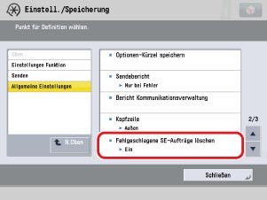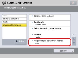 → [Einstellungen Funktion] → [Senden] → [Allgemeine Einstellungen] → [Fehlgeschlagene SE-Aufträge löschen].
