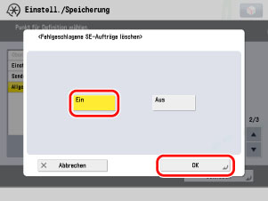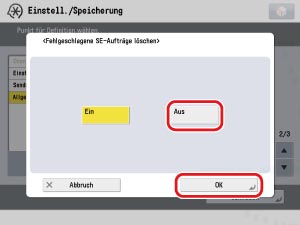 → [Einstellungen Funktion] → [Empfangen/Weiterleiten] → [Allgemeine Einstellungen] → [Fehlgeschlagene SE-Aufträge löschen].
