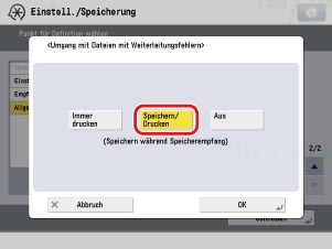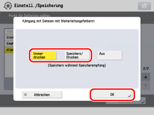 → [Einstellungen Funktion] → [Empfangen/Weiterleiten] → [Allgemeine Einstellungen] → [Vorgang bei Dateien m. Weiterleitungsfehlern] → Wählen Sie [Speichern/Drucken] → Betätigen Sie die Taste [OK].