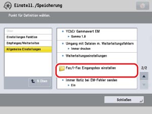 → [Einstellungen Funktion] → [Empfangen/Weiterleiten] → [Allgemeine Einstellungen] → [Fax/I-Fax Eingangsbox einstellen].