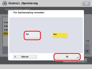 Berühren Sie die Taste [Fax Speicherempfang verwenden] → [Ein].