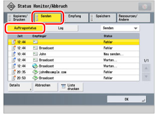 Der Status aller zu sendenden Aufträge (Fax, Internet-Fax, Dateiübertragung, E-Mail und Weiterleitung) wird angezeigt, und <Fehler> wird bei Weiterleitungsfehlern genau so angezeigt wie bei anderen Übertragungsfehlern.