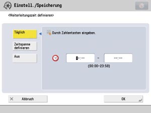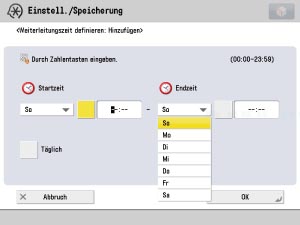 Mit der Funktion [Weiterleit. zeit defin.] können Sie das System so einrichten, dass Weiterleitungseinstellungen an bestimmten Tagen und zu bestimmten Zeiten gültig/ungültig sind. So können Sie beispielsweise eine Weiterleitung zu Zeiten unterbinden, in denen der Computer ausgeschaltet ist, wie nach Feierabend und an Feiertagen.