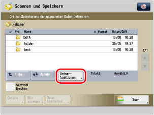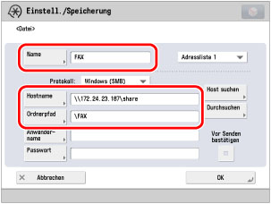 Berühren Sie [Name] → Geben Sie den Namen des erstellten Ordners ein → Stellen Sie [Hostname] und [Ordnerpfad] ein.