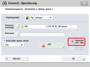 → [Einstellungen Funktion] → [Empfangen/Weiterleiten] → [Allgemeine Einstellungen] → [Einstellungen Weiterleitung] → [Weiterleitung ohne Beding.].