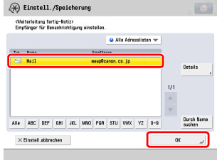 Wählen Sie den Empfänger, an den eine Benachrichtigung (Weiterleitung fertig-Notiz) gesendet werden soll → Berühren Sie [OK].