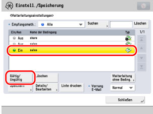 [Weiterleitung ohne Beding.] wird in den Weiterleitungseinstellungen angezeigt. Wählen Sie [Weiterleitung ohne Beding.] → Berühren Sie die Taste [Gültig/Ungültig], um die Weiterleitungsbedingung auf 'Ein' zu setzen.