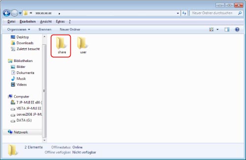 Geben Sie die IP-Adresse des Empfängers plus "/share" ein, um dem Gemeinsamen Speicherplatz zu speichern.