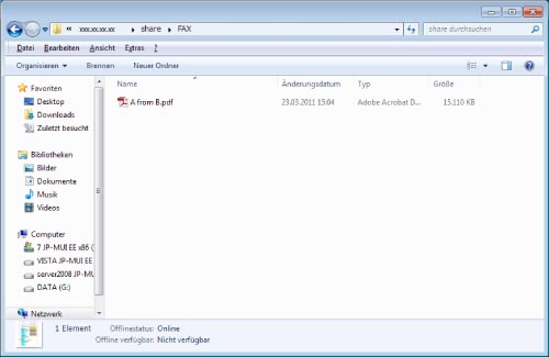 Alle empfangenen Faxdokumente werden nun an den erstellten Ordner gesendet. Nach beendeter Weiterleitung wird eine Benachrichtigung (Weiterleitung fertig-Notiz) an die angegebene Adresse gesendet.
